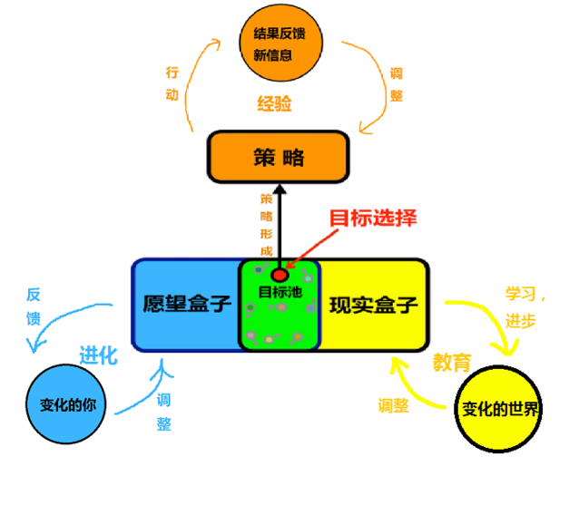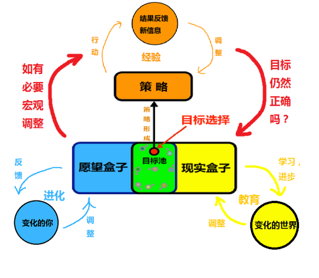 對于所有這些部門來說,盒子代表了目前的假說,圓環(huán)代表了可以被用來調(diào)整這些假說的新信息源。我們必需記住,這些圓環(huán)才是大頭,而非這些盒子——這些盒子只是盡己所能的讓圓環(huán)驕傲。假如我們和圓環(huán)內(nèi)容脫節(jié),盒子中的信息就會(huì)過期,無法有效支持決議計(jì)劃制定。 讓我們撤退退卻一步,把軟件視為一個(gè)整體。我們看到,下面是目標(biāo)形成機(jī)制,上面是目標(biāo)達(dá)成機(jī)制。實(shí)現(xiàn)目標(biāo)通常需要精準(zhǔn)聚焦。你需要放大微觀圖像,全新投入到目標(biāo)當(dāng)中,制定策略,瞄準(zhǔn)它。 但是,跟著時(shí)間推移,愿望之盒和現(xiàn)實(shí)之盒會(huì)調(diào)整自己的內(nèi)容,改變自己的形態(tài),終極,其他情況發(fā)生了——目標(biāo)池變了。 目標(biāo)池正好是愿望之盒和現(xiàn)實(shí)之盒發(fā)生重疊的地方,其外形和內(nèi)容完全取決于這些盒子的狀態(tài)。當(dāng)你糊口在位于上方的目標(biāo)達(dá)成機(jī)制中時(shí),確保你的奮斗的對象與下方的目標(biāo)池繼承保持一致,這很重要。——所以,讓我們再加上兩個(gè)大的紅箭頭: