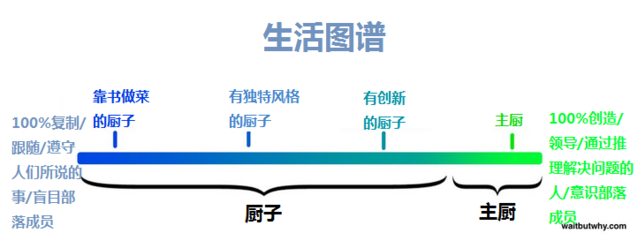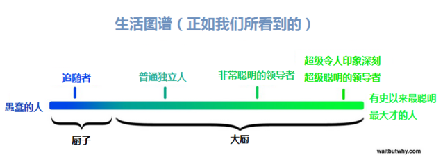 但我很肯定,大多數(shù)人看見這張光譜圖時(shí),他們以為自己在其中的位置遠(yuǎn)比實(shí)際位置靠右。通常,我們比自己以為的更像廚子——只不外從自身的立足點(diǎn)看不見這個(gè)真相。 好比說: 從定義上說,廚子是追隨者。他們之所以是廚子,恰是由于不管他們做什么事,都在追跟著某種菜譜。但是,我們中的絕大多數(shù)人并不以為自己是追隨者。 我們以為,追隨者是沒有自己思惟的怯夫。我們老是想著自己的領(lǐng)導(dǎo)地位、工作積極性,并且,我們不可能讓朋友們對我頤指氣使。我們把這些當(dāng)做自己不是追隨者的證據(jù),從而證實(shí)自己不僅僅只是一個(gè)廚子。 但題目是——以上這些事情只能證實(shí),你在你的群體中不是追隨者。正如愛因斯坦所說: 要成為一個(gè)羊群的完美成員,你首先要成為一只羊。 也就是說,你在自己的世界或社會(huì)階層中或許被看做一個(gè)明星或領(lǐng)導(dǎo)者,但是,如果你當(dāng)初以此為目標(biāo)的首要原因恰是由于你的群體菜譜告訴你,這是一件重要的事,它能讓群體的其他成員為你折服和仰望你,那么,你就不是一個(gè)領(lǐng)導(dǎo)者——你只是一個(gè)超級成功的追隨者。再如愛因斯坦所說,你和那些折服于你的人一樣,都未闊別廚子。 為了獲得真相,你必需把鏡頭拉遠(yuǎn),直到你能看到廚子的領(lǐng)導(dǎo)者——菜譜。 然而,當(dāng)我們面臨自己的糊口時(shí),我們并不善于縱觀全局。反而是糾結(jié)于細(xì)節(jié),那看似唯一無二的獨(dú)立自我可能只是一個(gè)視錯(cuò)覺。有時(shí)你感覺自己在獨(dú)立推理,但當(dāng)把鏡頭拉遠(yuǎn)時(shí),你才會(huì)發(fā)現(xiàn),原來你只是在別人定好步驟的棋盤上玩「連連看」。你感覺自己是個(gè)有原則的人,但實(shí)際上那只是你所在的群體的普遍原則。你覺得自己很有主見,但或許那只是父母、媒體、朋友、宗教或名人灌注貫注給我們的觀點(diǎn)。你感覺你自己選擇了自己的人生道路,但實(shí)際上只是一條提前設(shè)好的、并經(jīng)由了群體一致同意的黃磚路。你覺得你在《秘密花園》里施展創(chuàng)造力——但請留意,顏色不要涂到線條外面。 因?yàn)檫@些視錯(cuò)覺的存在,我們看不見自己思索中的缺陷,也無法辨認(rèn)出真正的思惟家,即便他泛起在我們眼前。相反,當(dāng)一個(gè)在科學(xué)思維和獨(dú)立思索上技壓群雄的大廚(如馬斯克、喬布斯或愛因斯坦)泛起時(shí),我們把他們的成功歸因于什么呢? 他們的硬件真他媽的了不起。