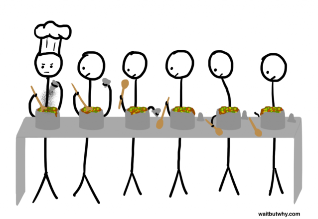 從馬斯克身上,我們看到一個(gè)極具天賦、愿景和超人膽量的人。但我們會(huì)不由自主地假定,所有的這些特征多多少少是與生俱來的。所以對我們來說,譜系看起來更像下面這樣: 在我們的心中,我們都是獨(dú)立思索的大廚——只不外馬斯克真的是一個(gè)令人印象深刻的大廚。 這種看法,既高估了馬斯克,也高估了我們自己。真相完全不是這樣的。 當(dāng)然,馬斯克確實(shí)是一個(gè)令人印象深刻的大廚,但是,他之所以極端杰出,并不是由于他令人印象深刻,而是由于,我們中的絕大多數(shù)人根本不是大廚。 這就似乎一堆打字機(jī)望著一臺計(jì)算機(jī)說:「哥們兒,那真是一臺天才的打印機(jī)! 我們之所以難以瞥見事實(shí)真相,是由于我們沒把大腦中的軟件當(dāng)回事。我們不把大腦看做計(jì)算機(jī),所以我們根本沒有意識到硬件和軟件的區(qū)別。當(dāng)我們想到大腦時(shí),我們只留意到了硬件——那些與生俱來、難以改變或晉升的東西。而我們的推理過程則更無形。我們把推理看做一件天然而然發(fā)生的事,就像體內(nèi)的血流一樣——它是自動(dòng)發(fā)生的過程,對它沒什么好說的,也沒什么好做的。 假如我們看不到硬件和軟件的區(qū)別,我們當(dāng)然就看不到大廚級別軟件和廚子級別軟件之間的差異。 理解我們與生俱來的邏輯思維「軟件」是一項(xiàng)重要的人生技能,它能被學(xué)到、訓(xùn)練和晉升,同時(shí)也是一個(gè)將成大事者和普通人區(qū)分開的主要因素。而忽略了我們邏輯思維「軟件」的本質(zhì),我們將留意不到人生游戲展開的舞臺。假如我們沒有意識到,推理是一個(gè)可以被創(chuàng)造或復(fù)制的東西——將導(dǎo)致我們將自己廚子般的行為誤以為獨(dú)立推理,然后,我們將大廚們真正的獨(dú)立思索誤以為超乎平常的魔法能力。 三個(gè)例子: 1)我們把大廚們對現(xiàn)在的清楚熟悉誤以為是對未來的愿景馬斯克的妹妹Tosca說「馬斯克已經(jīng)去過了未來,然后歸來告訴我們他在未來發(fā)現(xiàn)了什么。」這是很多人對馬斯克的感覺——他擁有極佳的愿景,能看到我們看不到的東西。好比說,我們看到的東西是下面這樣: