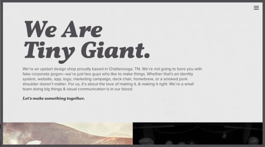 2014年,字體在很多網(wǎng)站設(shè)計(jì)中施展重要作用,我未發(fā)現(xiàn)這種趨勢(shì)在短期內(nèi)改變的跡象?墒2015年,我看到網(wǎng)站中的標(biāo)題和字體變得越來越大。夸張地說,就連天上的飛機(jī)可能都能看到地面上的字。當(dāng)你訪問Tiny Giant的網(wǎng)站時(shí),你會(huì)看到很大的字體。這實(shí)際上是一種聲明,讓你很難錯(cuò)過。大字體將繼承在2015年的網(wǎng)站設(shè)計(jì)中施展重要作用,成為確保進(jìn)步訪客視覺層次的方法。訪客首先會(huì)看到最大的字體,由于那會(huì)首先吸引你的留意力。