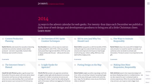 響應(yīng)式網(wǎng)站設(shè)計(jì)已經(jīng)流行了一段時(shí)間,可是直到近來,大多數(shù)網(wǎng)站設(shè)計(jì)重點(diǎn)都放在令網(wǎng)站在桌面設(shè)備上看起來更好,而在手機(jī)或平板設(shè)備上看得過去即可。不管何種設(shè)備,響應(yīng)式網(wǎng)站設(shè)計(jì)正邁向更好體驗(yàn)。我們正看到這種設(shè)計(jì)元素向移動(dòng)設(shè)備上轉(zhuǎn)移,并在更廣泛地使用。好比24ways與Rawnet都展示了這種觀念,將類似應(yīng)用和響應(yīng)式菜單添加到整個(gè)網(wǎng)站中,而不僅僅有更小視口的設(shè)備上。在這種情況下,這兩家網(wǎng)站選擇靠左或靠右的垂直菜單,而不是位于頂部的水平菜單,使用起來更像彈出/滑出應(yīng)用式菜單,這種技術(shù)答應(yīng)網(wǎng)站應(yīng)用與響應(yīng)式設(shè)計(jì)泛起在更小的視口上。