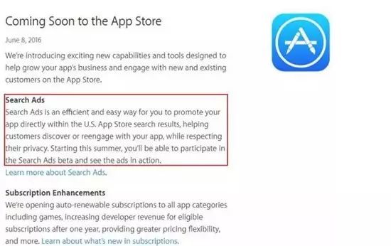 蘋(píng)果官方網(wǎng)頁(yè)對(duì)于 App Store 付費(fèi)推廣的說(shuō)明 App Store 2.0 的另一個(gè)重大改變就是加入付費(fèi)推廣模式。蘋(píng)果將答應(yīng)開(kāi)發(fā)者在 App Store 搜索頁(yè)面付費(fèi)推廣自己的應(yīng)用,Phil Schiller 指出,開(kāi)發(fā)者可以付費(fèi)以增加自己 App 的曝光度。舉例來(lái)說(shuō),某一款照片應(yīng)用加入了付費(fèi)推廣,那么,用戶在 App Store 內(nèi)搜索「照片」或者類似的樞紐詞時(shí),這款照片應(yīng)用就會(huì)泛起在所有 App 搜索結(jié)果列表的第一個(gè),而開(kāi)發(fā)者付費(fèi)推廣的 App,會(huì)顯示淺藍(lán)色的底色。