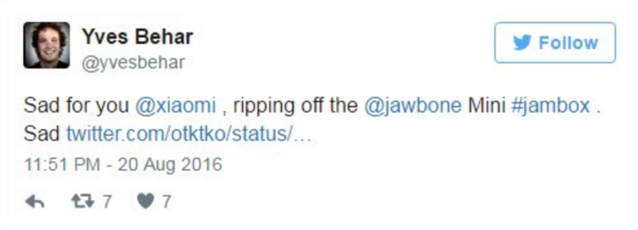 近日,小米副總裁雨果·巴拉在接受?chē)?guó)外媒體采訪時(shí)透露,小米很快將在美國(guó)開(kāi)售智能手機(jī)。然而,手機(jī)還沒(méi)開(kāi)始賣(mài),小米藍(lán)牙音箱就被Jawbone以為是抄襲了他們的產(chǎn)品。 Jawbone首席運(yùn)營(yíng)官、Fuseproject首席設(shè)計(jì)師伊夫斯·貝哈爾在Twitter上直接@小米,稱(chēng)小米方盒子藍(lán)牙音箱抄襲了自家的Jawbone Mini Jambox音箱的設(shè)計(jì),并且對(duì)小米的行為感到悲哀。