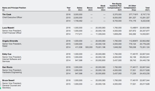 蘋果公司舉例想證實App Store在iPhone銷量下滑的情況下,應用銷售在特定地區(qū)是增長的,新游戲推動了應用銷售增長,以及用戶適應訂閱模式愿意長期支付用度。 App Store等服務業(yè)務帶來的營收是蘋果公司上一年財報中未幾的亮點,也是蘋果公司高管一直夸大重點發(fā)展的業(yè)務,即便App Store營收目前還無法撐起iPhone等硬件銷售下滑帶來的負面影響,不外增速老是讓人滿足的,并且App Store營收相稱于純收入,這些都是可以直接計入利潤的。 蘋果公司表示自2008年App Store面世以來,開發(fā)者已經(jīng)獲得了超過600億美元收入,推導可知蘋果公司獲得257億美元的收入,這都是現(xiàn)金流,直接晉升利潤,股東天然滿足。 蘋果公司高管現(xiàn)金激勵減少 但他們收入主要部門是期權(quán) 蘋果公司高管接受總薪酬減少的動靜,是SEC文件表露而恰好泛起,這是高管們對蘋果公司總營收下滑負責的一種表現(xiàn)方式,但假如仔細研究高管們的總薪酬,大家就會明白,高管們薪酬減少的絕對值并未幾,這是由于高管們和普通員工薪酬構(gòu)成的不同。 對于美國的科技公司員工來說,薪酬包括基本薪酬(年薪)、年終獎金以及期權(quán),在年薪固定或每年微漲、期權(quán)按工作時間兌現(xiàn)的情況下,年終獎金會影響到總薪酬的多寡。媒體報道中不僅僅是庫克總薪酬減少,蘋果高管們的薪酬同樣受到影響,均勻整體下滑10.5%。在2016年之前的4年,由于蘋果公司年年增長的業(yè)績,蘋果的高管是獲得最高額的現(xiàn)金激勵的,2016年蘋果公司的總營收和盈利都不如預期,這也影響到蘋果公司高管們的錢包,但是數(shù)據(jù)列出來后,大家就會發(fā)現(xiàn)高管們總薪酬減少的數(shù)額并未幾——對于他們2000萬美元的總薪酬來說,對于普通員工這當然是一大筆錢了。高管們薪酬的大頭是期權(quán),而普通員工比較正視現(xiàn)金獎勵,由于期權(quán)總數(shù)有限。 詳細到蘋果公司CEO庫克,他的2016年總薪酬為870萬美元,比2015年的1030萬美元減少160萬美元,而這是他基本薪酬從200萬美元增加到300萬美元的基礎上,所以庫克今年拿得手的現(xiàn)金獎金比去年減少263萬美元。 SEC(美國證券交易委員會)表露的蘋果公司文件顯示,蘋果公司CEO Tim Cook(蒂姆·庫克)2014財年薪酬總額為922萬美元,是其2013財年薪酬(430萬美元)的2.1倍,其中包括工資174萬美元,非股權(quán)激勵薪酬670萬美元。研究每年詳細的數(shù)據(jù)可知庫克每年的基本薪酬是在增長的,分別從2014年的174萬美元,2015年的200萬美元到2016年的300萬美元,確定庫克基本薪酬的就是蘋果公司薪酬委員會,這個委員會也決定所有其他高管的薪酬。 對于高管來說,總薪酬比去年降低也不是良多,由于期權(quán)獎勵是同樣的。他們總薪酬中的大頭恰是期權(quán)獎勵。