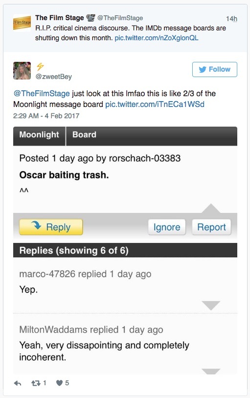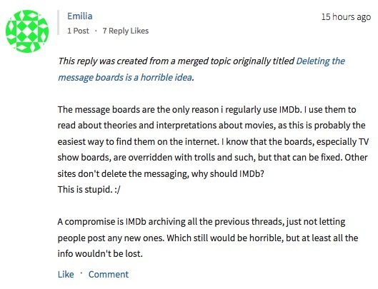 美國時(shí)間 2017 年 2 月 3 日,IMDb 公布將于 2017 年 2 月 20 日正式封閉留言板功能(Message Boards),而供用戶進(jìn)行溝通的私信功能(Private Message)也將隨之下架。 成立于 1990 年,IMDb(Internet Movie Database,互聯(lián)網(wǎng)片子數(shù)據(jù)庫)是國際著名的片子、電視和名人資訊網(wǎng)站,以其“神秘且權(quán)勢巨子”的評(píng)分機(jī)制、龐大齊全的片子電視資料庫著稱。 除了常規(guī)的影視基本資訊外(如上映時(shí)間、演員和制作團(tuán)隊(duì)、預(yù)報(bào)片、作品評(píng)論等),在每個(gè)影視作品條目下還會(huì)包括良多“影迷范兒”十足的用戶出產(chǎn)內(nèi)容(UGC),如:經(jīng)典語錄(Quotes)、片子漏洞(Goofs)、冷知識(shí)(Trivia)、片子原聲等,是不少深度影迷觀影前后必到“圣地”。 影視作品作為一種可解讀性極強(qiáng)的文本,離不開觀眾對于文本甚至人物的討論,而這一任務(wù)則由“留言板”來承載。固然名為“留言板”,但該功能實(shí)在就是“論壇”,注冊用戶針對不同條目創(chuàng)建話題,發(fā)起討論。除了每個(gè)影視作品、人物條目下都會(huì)配備留言板以外,IMDb 還設(shè)置了 47 個(gè)主要討論版塊,并有超過600 萬注冊用戶使用過留言板的功能。 (圖自 Reddit) 據(jù)聲明,本次對留言板功能的撤銷是經(jīng)由了“仔細(xì)考慮,且基于數(shù)據(jù)和流量”作出的決定,并宣稱,用戶現(xiàn)已逐漸將討論轉(zhuǎn)移到 IMDb 的其它官方社交賬號(hào)上,如 Facebook、 Twitter、Tumblr 等,原“留言板已不再為全球每月 2.5 億全球用戶提供積極、有用的體驗(yàn)”。 在 IMDb 的討論區(qū)中,動(dòng)靜一宣布,不少用戶都跟帖表示對該決定的反對,并以為社交賬號(hào)并不可替換原留言板的功能。