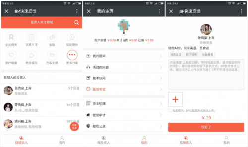 第2次轉型,聚份子將形式做得更輕,全部項目的中心業(yè)務環(huán)繞BP付費投遞,做創(chuàng)投界的“分答”。出資人在渠道上自行定制發(fā)問報價,創(chuàng)業(yè)者上載自個的BP,向心儀的出資人付費發(fā)問,這么一方面假如出資人看到并不是太符合要求的項目也有有些的時刻補償,一起創(chuàng)業(yè)者也能夠經(jīng)過自動投遞迅速取得出資反應。別的感興趣的“圍觀大眾”還能夠挑選“偷聽”,低本錢學習出資人對項目的判別及看法。經(jīng)過這種方式,聚份子一個月內(nèi)就協(xié)助30多個項目迅速地找到意向的出資組織,最快的耗時不到10分鐘。并且在這30幾個項目中,很多的是對本來傳統(tǒng)項目進行改造的二三線城市創(chuàng)業(yè)者,遍及現(xiàn)階段都有數(shù)百萬乃至千萬的流水,而這些項目是本來的投融資渠道效勞不到的。