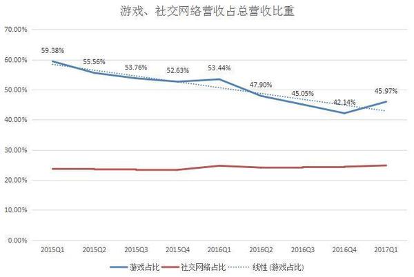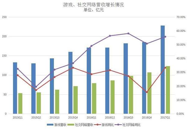 在騰訊發(fā)布新一季度財報之前,一眾剖析師都非?春。而在這之前,羅永浩曾直言“騰訊股市漲得比北京房價好”。那么騰訊新一季度的效果到底有剖析師所猜測的那么好嗎?別的收割很多玩家的《玩著榮耀》游戲又給騰訊奉獻了多少收入? 5月17日,騰訊發(fā)布了2017財年第一季度的效果陳述。該季度公司的營收為495.52億元(71.82億美元 ),同比增加55%;運營盈余192.72億元(27.93億美元),同比增加44%;公司權(quán)益持有人應(yīng)占盈余為144.76億元(20.98億美元),同比增加58%。 作為早年建立的互聯(lián)網(wǎng)公司之一,騰訊的開展也閱歷了幾次大的戰(zhàn)略調(diào)整。從近來兩年的財報數(shù)據(jù)來看,公司的營收和凈利潤增速在持續(xù)上升且創(chuàng)了新高。但在2015Q2和2016Q4這兩個季度,營收曾遭受下滑。 騰訊開始以及時通訊東西發(fā)家,現(xiàn)在公司的事務(wù)現(xiàn)已掩蓋游戲、交際網(wǎng)絡(luò)、付出、云核算等。從營收構(gòu)造來看,公司首要有增值效勞事務(wù)營收、網(wǎng)絡(luò)廣告事務(wù)營收和別的事務(wù)營收三大首要來歷。其間,增值效勞事務(wù)依然為公司奉獻了最多的收入。 游戲立異高,占總營收比重有所上升 作為騰訊最掙錢的事務(wù)大頭,該季度公司的增值效勞營收同比增加41%至351.08億元。 其間,來自網(wǎng)絡(luò)游戲的收入增加34%至228.11億元。游戲事務(wù)增加首要由智能手機游戲(如《王者榮耀》、《穿越前方:槍戰(zhàn)王者》及《龍之谷》)及PC客戶端游戲(如《英豪聯(lián)盟》、《FIFA Online 3》及《地下城與勇士》)所奉獻。盡管這次騰訊沒有發(fā)布《王者榮耀》的詳細效果,但上個季度公司曾泄漏游戲的日活潑用戶超越了5000萬。 詳細來看,來自PC客戶端的游戲收入為141億元,同比增加24%;來自智能手機游戲的收入為129億元,同比增加57%。 別的,來自交際網(wǎng)絡(luò)的收入增加56%至122.97億元。該項收入增加首要反映數(shù)字內(nèi)容效勞(包含數(shù)字音樂、視頻及文學(xué)效勞)及虛擬道具銷售收入的增加。 近來幾年,經(jīng)過自研IP游戲、代理游戲以及“買買買”的方法騰訊現(xiàn)已是全球最掙錢的游戲公司。正如剖析師所猜測的,騰訊的游戲收入又帶來了“驚喜”——創(chuàng)了前史新高。 不過,為了疏解收入構(gòu)造單一帶來的潛在危險,騰訊一向都在擴大別的事務(wù)的營收,然后降低游戲在總收入中的占比。 從游戲和交際網(wǎng)絡(luò)營收增速的比照圖來看,近來兩年時間里前者都要慢于后者。從這兩項事務(wù)占公司總營收的比重來看,交際網(wǎng)絡(luò)一向保持在20%-30%之間。而游戲收入占比則在直線降低,在2016Q2降低至50%一下,在2016Q4占比僅為42.14%。但到了該季度,占比又有所上升。 網(wǎng)絡(luò)廣告營收增速趨于穩(wěn)定,交際廣告同比增加67% 除了游戲外,網(wǎng)絡(luò)廣告算是騰訊要點規(guī)劃的事務(wù)之一了。 在這之前,騰訊曾調(diào)整了廣告事務(wù)的人事錄用,以進一步挖掘該事務(wù)的潛在價值并提高它的戰(zhàn)略地位。此前還有業(yè)內(nèi)人士剖析認為,未來騰訊也許會開展成了一個以廣告事務(wù)為主的公司,比方廣告營收占比高達85%的Facebook。 該季度網(wǎng)絡(luò)廣告的營收同比增加47%至68.88億元。但比較2016Q3和2016Q4的74億元和83億元則有所降低。從曩昔兩年的數(shù)據(jù)來看,來自網(wǎng)絡(luò)廣告的增速現(xiàn)已離別之前動輒三位數(shù)的增加,而保持在40%-50%之間。 從廣告占總營收的比重來看,比較前幾季度也有所降低,為13.91%。這一數(shù)字要低于交際網(wǎng)絡(luò)在總營收中的占比。關(guān)于廣告事務(wù)的開展,騰訊現(xiàn)已在國內(nèi)外進行積極的規(guī)劃,不知道終究是否能取得不錯的效果。 在該季度,騰訊對廣告事務(wù)的詳細區(qū)分進行了調(diào)整。不再是效果廣告和品牌展現(xiàn)廣告,而是按廣告特點和非廣告特點來區(qū)分:
