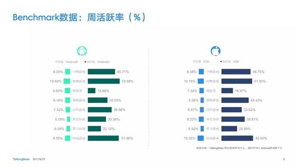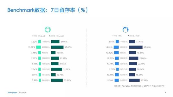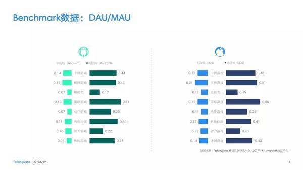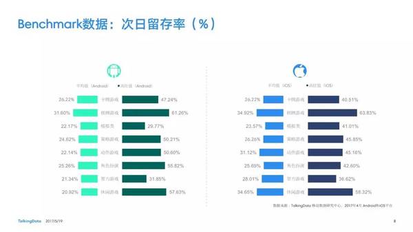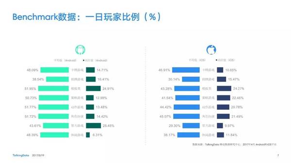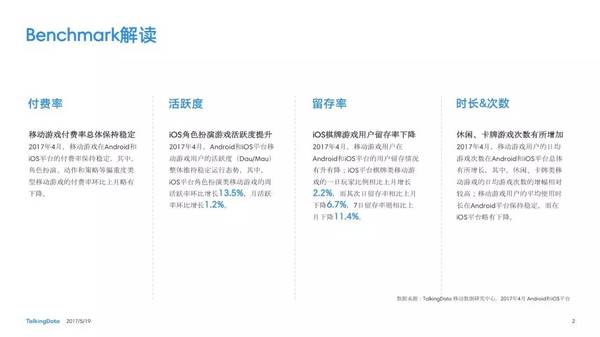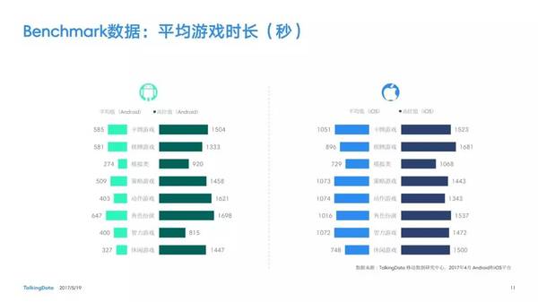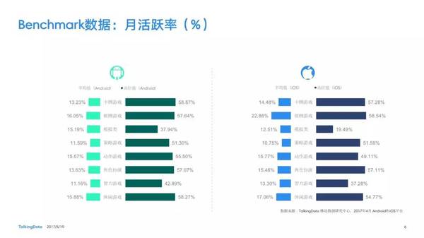 付費(fèi)率:2017年4月,移動(dòng)游戲在Android和iOS渠道的付費(fèi)率保持安穩(wěn),其間,角色扮演、動(dòng)作和戰(zhàn)略等偏重度類型移動(dòng)游戲的付費(fèi)率環(huán)比上月略有降低; 用戶活潑度:2017年4月,Android和iOS渠道移動(dòng)游戲用戶的活潑度(Dau/Mau)全體保持安穩(wěn)運(yùn)轉(zhuǎn)態(tài)勢(shì),其間,iOS渠道角色扮演類移動(dòng)游戲的周活潑率環(huán)比增加13.5%,月活潑率環(huán)比增加1.2%; 用戶留存率:2017年4月,移動(dòng)游戲用戶在Android和iOS渠道的用戶留存狀況有升有降;iOS渠道棋牌類移動(dòng)游戲的一日玩家份額比較上月增加2.2%,而其次日留存率比較上月降低6.7%,7日留存率則比較上月降低11.4%; 運(yùn)用時(shí)長(zhǎng)&次數(shù):2017年4月,移動(dòng)游戲用戶的日均游戲次數(shù)在Android和iOS渠道整體有所增加,其間,休閑、卡牌類移動(dòng)游戲的日均游戲次數(shù)的增幅相對(duì)較高;移動(dòng)游戲用戶的均勻運(yùn)用時(shí)長(zhǎng)在Android渠道保持安穩(wěn),而在iOS渠道略有降低。 |