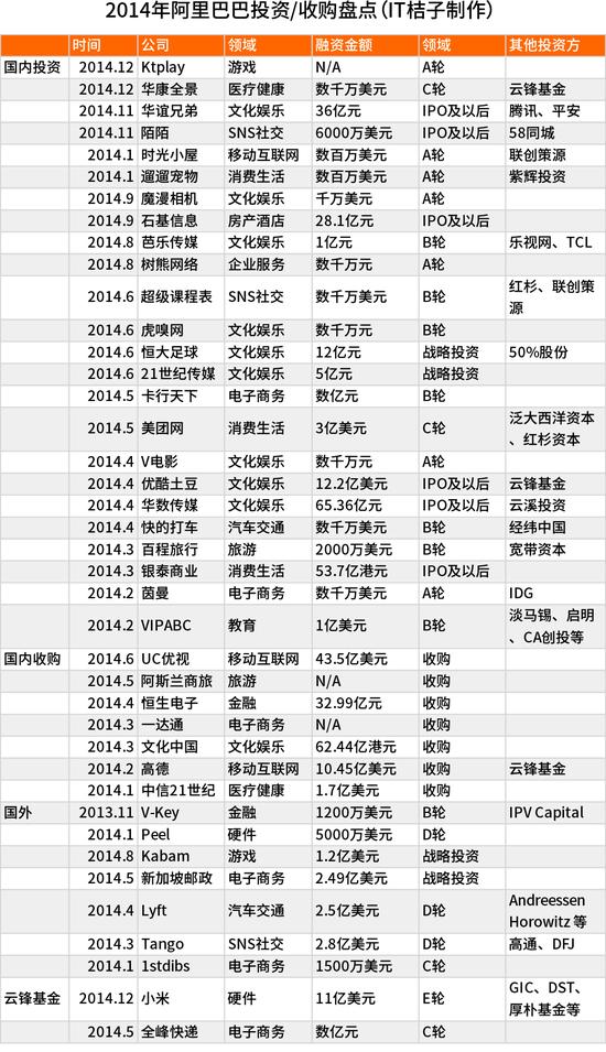![]() 2014年的海內(nèi)互聯(lián)網(wǎng)創(chuàng)業(yè)投資空前火熱、互聯(lián)網(wǎng)的巨頭們布局也如火如荼,一方面是自營業(yè)務(wù)的不斷擴(kuò)張,各類平臺(tái)各種新產(chǎn)品,一方面是大手筆的投資和并購,從海內(nèi)到國外,幾乎分布在各個(gè)行業(yè),讓整個(gè)2014年的海內(nèi)互聯(lián)網(wǎng)版圖風(fēng)云變幻。 IT桔子(itjuzi.com)是一家關(guān)注中國IT互聯(lián)網(wǎng)創(chuàng)業(yè)投資的數(shù)據(jù)庫和貿(mào)易信息服務(wù)提供商,最近發(fā)布了《2014年度中國互聯(lián)網(wǎng)創(chuàng)業(yè)投資清點(diǎn)》,用數(shù)據(jù)和觀點(diǎn)清點(diǎn)2014年海內(nèi)互聯(lián)網(wǎng)創(chuàng)業(yè)、投資、至公司格式、上市、失敗等全方位的信息。 以下是清點(diǎn)內(nèi)容: 一、阿里巴巴 王者加冕,2014年9月19日,阿里巴巴正式上市,造就美股最大IPO的歷史記實(shí)之外,也是其一場(chǎng)盛大的成人禮。 從電子商務(wù)出發(fā),阿里巴巴打造了一個(gè)很大的貿(mào)易生態(tài)系統(tǒng),通過自有業(yè)務(wù)、資本手段,構(gòu)建著一個(gè)龐大且具備相互協(xié)作遠(yuǎn)景的貿(mào)易大版圖。在這張版圖中,阿里巴巴的“互聯(lián)網(wǎng)帝國”囊括了電子商務(wù)、金融、本地糊口O2O、教育、旅游、汽車、房產(chǎn)、醫(yī)療健康、硬件、游戲等各個(gè)領(lǐng)域。與此同時(shí),阿里巴巴的戰(zhàn)略在全球化的生態(tài)鏈中,也在開始進(jìn)一步拓張。 總體看,阿里巴巴在2014年主要圍繞自身貿(mào)易生態(tài)系統(tǒng),不斷向內(nèi)深化、向外拓展,并通過自有業(yè)務(wù)和資本手段,逐漸在構(gòu)建一個(gè)比擬于在傳統(tǒng)行業(yè)做多元化業(yè)務(wù)(如GE)實(shí)現(xiàn)戰(zhàn)略協(xié)同不同,移動(dòng)互聯(lián)網(wǎng)時(shí)代因其生態(tài)性和連接性屬性,自然有利于系統(tǒng)性戰(zhàn)略布局,某種程度上看,阿里巴巴目前在這個(gè)方面略勝一籌。 首先,阿里巴巴過去多年核心的貿(mào)易模式是B2BC,即通過撬動(dòng)B端來激活C端,終極實(shí)現(xiàn)了從企業(yè)級(jí)服務(wù)向獲取流量進(jìn)口方向進(jìn)化,繼而不斷擴(kuò)大繁衍流量進(jìn)口。 其次,在演進(jìn)路徑上,阿里巴巴先從電商平臺(tái)服務(wù)端開始,積累起用戶規(guī)模和交易流量,然后基于電商交易環(huán)節(jié)打開金融與支付缺口,基于電商配送環(huán)節(jié)布局線下物流行業(yè),繼而在金融和物流兩個(gè)環(huán)節(jié)再一次挖掘和開釋流量,并將其獨(dú)立成又一個(gè)具備戰(zhàn)略性意義的節(jié)點(diǎn),圍繞其進(jìn)行深化布局。接著,阿里再進(jìn)一步利用海量交易信息扎根到更加基礎(chǔ)層的大數(shù)據(jù)和云計(jì)算技術(shù)環(huán)節(jié),構(gòu)建更具普遍意義的底層應(yīng)用技術(shù)系統(tǒng)。 與此同時(shí),在移動(dòng)和無線領(lǐng)域,阿里一方面將PC端積累的用戶和流量通過移動(dòng)端產(chǎn)品進(jìn)行遷移、轉(zhuǎn)化,另一方面,在移動(dòng)互聯(lián)網(wǎng)布局上,遵循元思索框架從基礎(chǔ)應(yīng)用層繼承進(jìn)行戰(zhàn)略布局,推出YUNOS、以及今年的“百川計(jì)劃”等,擴(kuò)展到移動(dòng)O2O糊口服務(wù)和社交等應(yīng)用場(chǎng)景當(dāng)中。在這個(gè)過程中,阿里同時(shí)要面對(duì)騰訊、百度甚至是Google、亞馬遜的挑戰(zhàn),詳細(xì)執(zhí)行和實(shí)施層面,必然是會(huì)有所得失,這也決定了阿里需要借助資本氣力來快速獲得相關(guān)戰(zhàn)略性資源,包括技術(shù)、產(chǎn)品以及團(tuán)隊(duì)。 最后,至于阿里涉夠數(shù)字娛樂、旅游、健康等領(lǐng)域,目前來看,遠(yuǎn)不到開花結(jié)果的時(shí)候,而是阿里為未來相稱長時(shí)間布下的棋子,預(yù)埋的種子。當(dāng)然,上述三個(gè)領(lǐng)域目前同樣能夠?yàn)榘⒗锏暮诵闹鳂I(yè)提供資源嫁接、流量進(jìn)口甚至是價(jià)值變現(xiàn)的可能。 1、阿里巴巴2014度投資并購清點(diǎn):170億美元 ![]() 從IT桔子數(shù)據(jù)庫來看,2014年阿里巴巴在投資和收購上特別活躍,先后進(jìn)行了超過40起的投資、而且一半以上的投資都是大手筆,超過了上億元人民幣,粗略計(jì)算阿里巴巴2014年的投資金額超過170億美元。 基于上述分析,結(jié)合IT桔子數(shù)據(jù)庫,我們來大致清點(diǎn)一下阿里巴巴2014年都在哪些方面進(jìn)行了新的布局。 從投資數(shù)目來看,阿里巴巴投資次數(shù)最多的TOP5領(lǐng)域接踵是:文化娛樂10 起投資、電子商務(wù)6起投資,移動(dòng)互聯(lián)網(wǎng)、消費(fèi)糊口O2O、SNS社交各有3起投資;從投資金額分布看,阿里巴巴出錢多的TOP5領(lǐng)域是:移動(dòng)互聯(lián)網(wǎng)54億美元、文化娛樂和消費(fèi)糊口O2O都有30億美元、金融25億美元、房產(chǎn)酒店17億美元。 從海內(nèi)外分布來看,阿里巴巴在2014年介入了國外7家公司的投資,涉及金額15.34億美元;行業(yè)籠蓋比較多,包括電商、金融、硬件、汽車交通、游戲等。 詳細(xì)來看阿里巴巴各個(gè)細(xì)分領(lǐng)域的分布: ![]() 移動(dòng)互聯(lián)網(wǎng)對(duì)于阿里巴巴的戰(zhàn)略意義不問可知,但阿里自身在船票方面一直不穩(wěn)固,在2014年阿里巴巴終于下定絕對(duì)收購UC優(yōu)視,拿到了一張船票的同時(shí)也付出了43.5億美元。