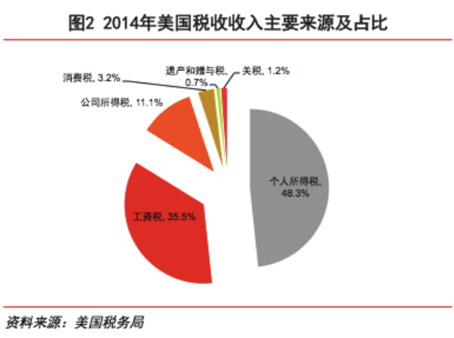同年,美國(guó)稅收收入(財(cái)政收入中去除無(wú)法歸類的其他收入)為 2.9萬(wàn)億美元,包含個(gè)人所得稅、工資稅和企業(yè)所得稅等的直接稅種占比高達(dá)95.6%,其中,個(gè)人所得稅就占到了稅收收入的將近一半。