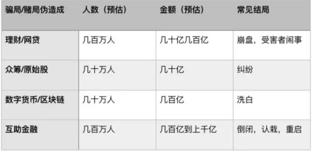 根據(jù)我的了解,我把他們大致分為以下幾類,他們的市場(chǎng)規(guī)模和結(jié)局大致如下: 看看網(wǎng)貸的那些崩盤(pán)的騙局,e租寶、大大團(tuán)體,每個(gè)都有數(shù)百億規(guī)模,這些崩盤(pán),都造成了巨大的影響。實(shí)在我理解后面三種的規(guī)模,都比這個(gè)理財(cái)崩盤(pán)的規(guī)模要大。 為什么騙了還能洗白?由于這些貪婪的受害者不覺(jué)得是被騙,認(rèn)為是賭輸了認(rèn)栽。炒幣輸了,互助倒了,他們都把原因歸結(jié)為命運(yùn)運(yùn)限不好,殊不知,背后實(shí)質(zhì)上是被騙了。只要受害者不鬧事,就沒(méi)有受害者。【不信你去舉報(bào)傳銷嘗嘗就知道了,公安說(shuō)你找工商,工商問(wèn)你你是受害者嗎,不是就不要瞎忙活,組織傳銷罪可沒(méi)有這么輕易定罪】 這些每個(gè)都是有備而來(lái),而且,都有成型的工業(yè)鏈和模式套路支撐。對(duì)中國(guó)的整個(gè)金融秩序,是莫大的傷害。這些每個(gè)都利用了投資人逐利和追求暴利的心態(tài)。不可否認(rèn),欲求不滿和貪婪是每個(gè)人的本能,冷靜節(jié)制才是后天培養(yǎng)的技能。 且截至目前,并沒(méi)有看到政府拿出切實(shí)可行的策略來(lái)應(yīng)對(duì)。甚至在去中央化傳銷等領(lǐng)域的法律基本都仍是空缺。即使被你抓到,你都沒(méi)法用現(xiàn)有的法律來(lái)進(jìn)行裁定。沒(méi)看到MMM都是公然的搞的嗎,沒(méi)看到套著“區(qū)塊鏈、數(shù)字貨泉”外衣的偽幣騙局都公然拉人開(kāi)大會(huì)嗎,由于按照現(xiàn)有法律,人家可能根本沒(méi)有違法。 我們能夠制定政策的央行和部委,處在高位,身邊會(huì)萃的學(xué)者說(shuō)客,忙著兩眼盯著技術(shù)立異國(guó)外發(fā)展標(biāo)榜自己,并不一定看得到這種具有中國(guó)特色的規(guī)?膳碌牡讓域_局怪相。出臺(tái)的政策方針可能并不能很好的應(yīng)對(duì)這些事情。 理財(cái)、網(wǎng)貸騙局因?yàn)镻2P網(wǎng)貸在前兩年的迅猛發(fā)展催生了這類公司。年底開(kāi)始泛起大量的跑路崩盤(pán)。 這種技術(shù)含量低,實(shí)施門(mén)檻低,易學(xué)易用,金向陽(yáng),e租寶,大大團(tuán)體都是典型,倒閉跑路的網(wǎng)貸平臺(tái)基本屬于這一類。設(shè)立資金池,吸納大量的公家資金進(jìn)行投資,給投資人高額回報(bào)作為誘惑;旧弦粌赡昃蜁(huì)爆掉。 他們常見(jiàn)的策略就是上央視廣告、和領(lǐng)導(dǎo)合影、交更多的稅、拿更多的獎(jiǎng)、租高大上寫(xiě)字樓、給優(yōu)厚的待遇、招大量的員工,拼命擴(kuò)大規(guī)模。以快和大來(lái)應(yīng)對(duì)一切泛起的題目。 面向?qū)ο蠡臼谴髬尨鬆。輕微有點(diǎn)互聯(lián)網(wǎng)使用習(xí)慣的都不大會(huì)上當(dāng)。 這些公司在爆掉之前,都是地方政府的香餑餑,由于稅多啊。這些公司一而再再而三的倒閉,讓投資人知道,任何廣告都不附帶信用,央視做著騙子廣告也可以免責(zé)。只要騙子還沒(méi)被法律界定,央視接他們的廣告,忽悠全中國(guó)人民,他們是不用承擔(dān)責(zé)任的,高鐵廣告同理。 這種跑路的理財(cái)公司,最后的結(jié)局都是爆掉,瘋狂擴(kuò)張民間借貸的互聯(lián)網(wǎng)加強(qiáng)版。 原始股、股權(quán)眾籌騙局你們有沒(méi)有朋友圈看到過(guò)這樣的廣告,一般都是鮮紅的圖配著亢奮的字,告訴你,暴富機(jī)會(huì)在面前,再不捉住就沒(méi)有了,再不投資就錯(cuò)過(guò)下一個(gè)馬云了。