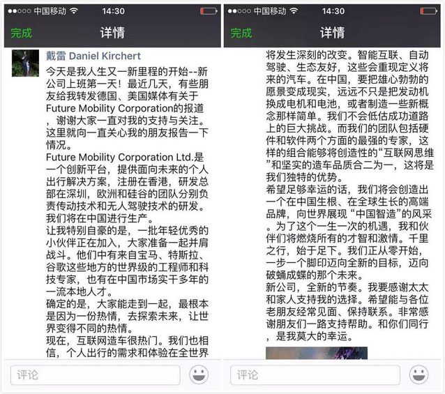Future Mobility COO 戴雷的朋友圈 目標是打造一個高端電動車品牌的 Future Mobility 注冊在香港,研發(fā)總部位于深圳,傳動技術和無人駕駛技術的研發(fā)分別放在歐洲和硅谷,將在中國進行整車出產(chǎn)。 和諧富騰旗下電動車項目經(jīng)濟+高真?zhèn)產(chǎn)品組合,很輕易讓人聯(lián)想起車和家、蔚來汽車這兩家電動車創(chuàng)業(yè)公司,他們的車型也分別定位于經(jīng)濟和高端。 從產(chǎn)品角度來看,未來很有可能泛起愛車 vs. 車和家、Future Mobility vs. 蔚來汽車捉對廝殺的競爭局面。