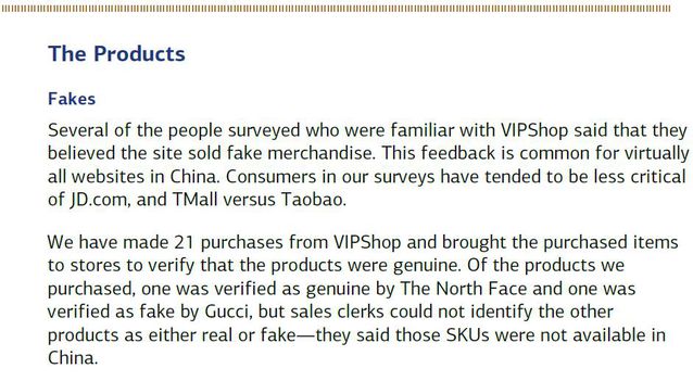 對(duì)于閃購(gòu)模式的唯品會(huì)而言,品牌在劃定的時(shí)間內(nèi)上新,通過(guò)折扣的方式,來(lái)刺激消費(fèi)者快速?zèng)Q議計(jì)劃購(gòu)買(mǎi)。在唯品會(huì)的首頁(yè)上,每個(gè)品牌上新的位置都很有限,也都意味著巨大的利益牽扯。一位曾上過(guò)唯品會(huì)的商家透露,唯品會(huì)在招商控制上層層審批,但想上唯品會(huì)(特別是首頁(yè))的品牌商趨之若鶩。即便治理上很?chē)?yán)格,但仍是避免不了一些“潛規(guī)則”。 事實(shí)上,聯(lián)系關(guān)系交易本身并不違法,根據(jù)SEC的要求,與上市公司產(chǎn)生聯(lián)系關(guān)系交易的行為必需要對(duì)外表露。這也是考慮到,聯(lián)系關(guān)系交易方可以運(yùn)用行政氣力撮合交易的進(jìn)行,從而有可能使交易的價(jià)格、方式等在非競(jìng)爭(zhēng)的前提下泛起不公正情況,形成對(duì)股東或部門(mén)股東權(quán)益的侵犯,也易導(dǎo)致債權(quán)人利益受到損害。 售賣(mài)未經(jīng)品牌商授權(quán)的商品 贗品對(duì)于電商來(lái)說(shuō),是一個(gè)“惡疾”。JCAP講演中夸大,調(diào)查了多位消費(fèi)者,均表示在唯品會(huì)上買(mǎi)到過(guò)贗品。 JCAP調(diào)查職員抽選了21個(gè)調(diào)查樣本,去品牌商的線下實(shí)體店驗(yàn)貨,其中樣本中的Gucci被證明為贗品,其余的商品樣本,銷(xiāo)售職員也無(wú)法辨明真?zhèn)巍?ldquo;這些商品的型號(hào)并沒(méi)有在中國(guó)銷(xiāo)售。”