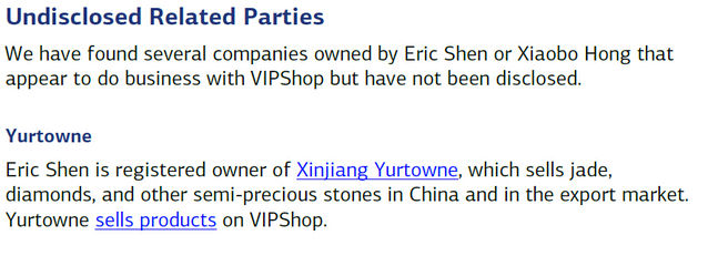 J CAP稱,董事長(zhǎng)兼CEO沈亞、副董事長(zhǎng)兼COO洪曉波至少持有三家公司與唯品會(huì)產(chǎn)生聯(lián)系關(guān)系交易。J CAP指出,沈亞控制的國(guó)玉這家公司(http://www.yurtowne.com)在唯品會(huì)上售賣(mài)產(chǎn)品。