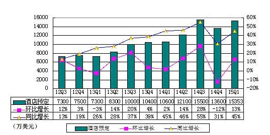 圖為攜程歷年來(lái)的酒店預(yù)訂營(yíng)收以及環(huán)比、同比增長(zhǎng)數(shù)。根據(jù)攜程的財(cái)報(bào)顯示,攜程自2012年至今,酒店?duì)I收的占比為39%——44%,系攜程旗下最重要的業(yè)務(wù)。藝龍的狀況和攜程類(lèi)似,酒店同樣是其最大的業(yè)務(wù)線。藝龍的內(nèi)部郵件也顯示,“我們期待在新股東的支持下,藝龍將能夠利用攜程的上風(fēng)資源,使藝龍更加專(zhuān)注在住宿預(yù)定服務(wù)上。”即雙方合作的重點(diǎn)也是在酒店業(yè)務(wù)上。 但攜程的酒店+藝龍的酒店是﹤2的,為何要這么說(shuō)呢?和攜程在酒店業(yè)務(wù)上的不亂性不同,藝龍的酒店業(yè)務(wù)固然是其自身最重要的業(yè)務(wù)線,但藝龍總體不容樂(lè)觀啊。