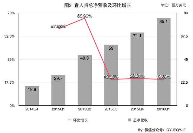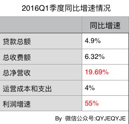 圖中紅框部門顯示,在Q2季度,Deferred revenue(遞延收入)和Cash revenue泛起失常,不遵循相關(guān)會(huì)計(jì)配比原則。 而風(fēng)險(xiǎn)預(yù)備金項(xiàng),基本維持在總收費(fèi)額的30%左右,符合配比原則。 (遞延收入,是暫時(shí)未確認(rèn)的收益意思,由權(quán)責(zé)發(fā)生制和收付實(shí)現(xiàn)制的暫時(shí)性差異產(chǎn)生)。 因此,我們發(fā)現(xiàn)了秘密所在:宜人貸通過調(diào)整遞延收入確認(rèn)時(shí)間以及人為控制的現(xiàn)金激勵(lì),調(diào)整了會(huì)計(jì)利潤,以符合相關(guān)上市要求。 這也解釋了,為什么凈利潤和總凈營收,會(huì)在Q2季度泛起意外不符合相關(guān)會(huì)計(jì)規(guī)律的現(xiàn)象。 在以后解讀宜人貸財(cái)報(bào),這兩個(gè)數(shù)據(jù),將是考驗(yàn)利潤“含金量”相對有效的地方。 在2016Q1季度,同比增速情況如下: