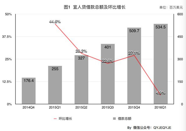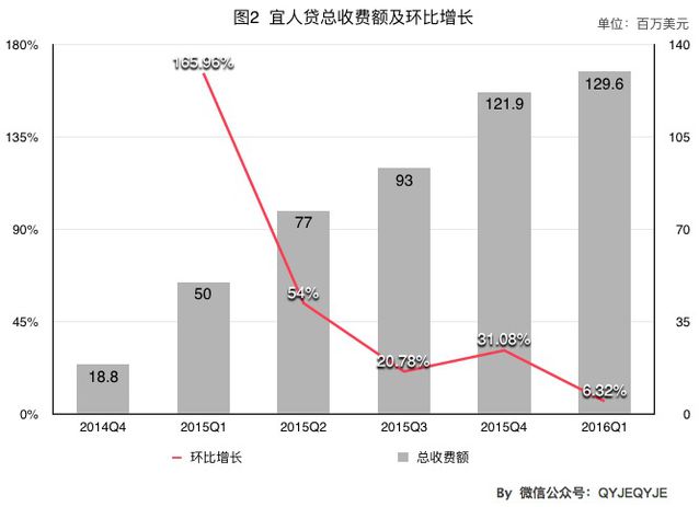 近期,跟著P2P標(biāo)桿Lending Club的隕落,股價(jià)斷崖式暴跌,9年的co-founder and CEO被逐出公司,fintech概念從神壇走下; 美國財(cái)政部隨后于5月10日發(fā)布網(wǎng)貸白皮書,題為“網(wǎng)絡(luò)市場化信貸的機(jī)遇與挑戰(zhàn)”(Opportunities and Challenges in Online Marketplace Lending),闡述對行業(yè)擔(dān)憂,政策風(fēng)口一再走緊; 雪上加霜的是,Google也于昨天晚間公布“下架小貸廣告”,成為壓垮美帝網(wǎng)貸的最后一根稻草,行業(yè)遠(yuǎn)景堪憂。 而與此同時(shí),大西洋彼岸擁有中國特色的P2P公司——宜人貸,高調(diào)發(fā)布了自己2016年Q1季度財(cái)報(bào),華麗的數(shù)字,使得股價(jià)也應(yīng)聲上漲5.83%。 本文將圍繞這一季財(cái)報(bào),展開分析,探討財(cái)報(bào)數(shù)字背后,這家P2P公司詳細(xì)的發(fā)展情況。 財(cái)務(wù)業(yè)績分析 看點(diǎn)一:借款總額、總收費(fèi)額,持續(xù)增長;環(huán)比增長,駛?cè)肼嚨?/strong> 先來看每季度借款總額變化情況,如下圖1