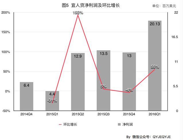 (注:總收費(fèi)額,意思毛收入總額,有兩個(gè)來源部門,一是來自借錢的人,另一部門來自投資的人,其中借錢的人,占大頭。也即從事中介借貸服務(wù),兩端收取的手續(xù)費(fèi),為其所有收入) 然而這樣一種變化趨勢,無疑是難以讓資本市場滿足的。 對于各家P2P平臺而言,平臺的借款總額,就猶如電商行業(yè)的GMV,體量和增速對公司在資本市場估值尤為致命。 作為一家奔跑著的創(chuàng)業(yè)公司,它的環(huán)比增長速度,卻泛起大幅度下滑。這是一個(gè)非常致命的信號。 假如后期發(fā)展增速繼承疲軟,那么華爾街將改變對其估值模型:由高速成長模型轉(zhuǎn)變?yōu)槌墒炀徛l(fā)展模型。 公司發(fā)展速度,回到社會(huì)資本均勻增長水準(zhǔn);股價(jià)也回調(diào)至緩慢上漲。 當(dāng)然,下一階段考慮到?jīng)]有了春節(jié)這個(gè)季節(jié)因素影響,個(gè)人以為存在一定的止跌可能; 然而,對于最近這段時(shí)間美國嚴(yán)肅的監(jiān)管立場,LC丑聞、海內(nèi)糟糕的投資環(huán)境,2016Q2季度的表現(xiàn),應(yīng)該不會(huì)比Q1季度好到哪里去。 對于資本市場而言,宜人貸發(fā)展遠(yuǎn)景、想象力確實(shí)十分有限,股價(jià)不會(huì)泛起大幅上揚(yáng)。 看點(diǎn)二:凈利潤表現(xiàn)搶眼,原來是存在很顯著的“操作利潤”情況