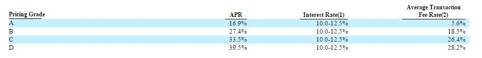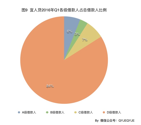 趨勢很顯著,宜人貸在2015Q4季度后,對于借款人以及標(biāo)的來源,有意識的降低要求,減輕對線下的資源依靠。其中,還專門表露了Q1季度,來自移動(dòng)借款真?zhèn)數(shù)據(jù)32.8%,PC端數(shù)據(jù)為55%,合計(jì)線上88%。 對于投資人方面,宜人貸已經(jīng)于2015Q4季度,全部實(shí)現(xiàn)了線上。目前投資資金全部來自線上,沒有通過線下交易。 說明其逐漸實(shí)現(xiàn)了網(wǎng)絡(luò)借貸本身的含義。 壞賬情況分析 看點(diǎn)五:刀尖上嗜血,風(fēng)險(xiǎn)加大 宜人貸把客戶分為ABCD四類,A類信用最高,D類信用最差。下圖是借款利率情況: