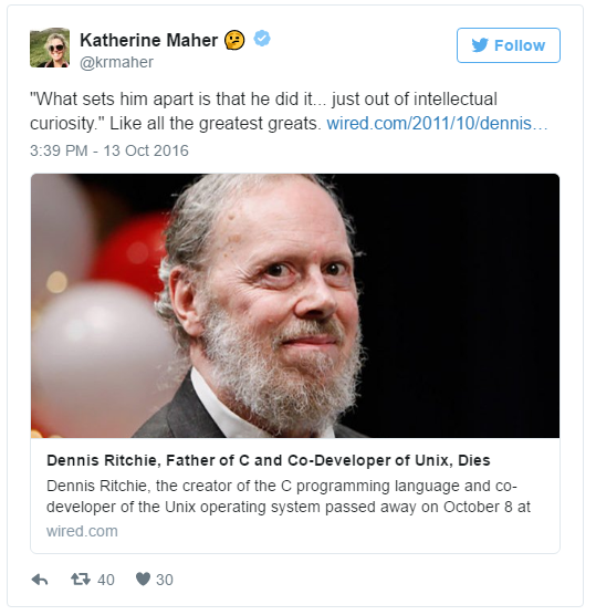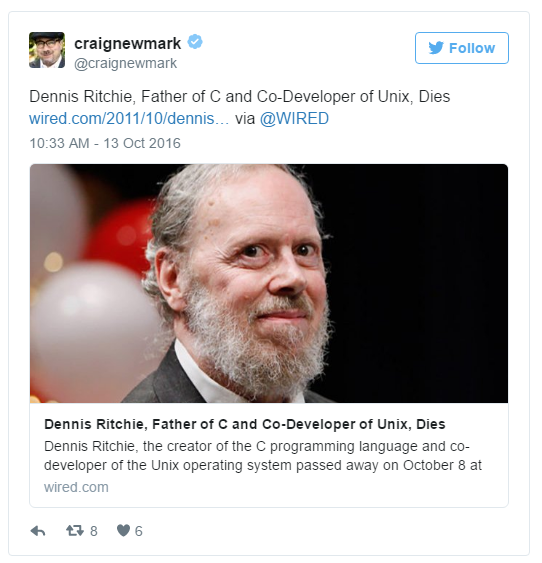 Dennis Ritchie 對于現(xiàn)代軟件技術(shù)的貢獻(xiàn)是毋庸置疑的,身為 C 語言同時也是 UNIX 之父,對于現(xiàn)代軟件以及系統(tǒng)的影響當(dāng)然非常大。他在 2011 年 10 月 13 日于紐澤西過世,當(dāng)時引起很多科技業(yè)重量級人物的哀悼。不外,基于某些錯誤,他近日在 Twitter 上“再度”過世了一次。 在社交網(wǎng)站上都有一些演算法的機(jī)制,會回顧過去幾年這一天所發(fā)生的信息。有的時候我們一不小心沒有留意日期,就會誤認(rèn)為是當(dāng)天所發(fā)生的事情。而這個在美國科技圈發(fā)生的烏龍事件,不清晰是不是也是由于這個演算法所引起的。 事情到底是誰開始?不外根據(jù) fossbytes的考證,溯源追蹤到 CNET 的科技界著名記者 Om Malik,他在 Twitter 發(fā)了一篇引述 Wired 報導(dǎo)、哀悼 Dennis Ritchie 的推文。而 Google 的 CEO Sundar Pichai 也推了這篇文章。 因為 Om Malik 的影響力,接下來又引出了兩位科技界的大咖的轉(zhuǎn)推。像是 Craig Newmark,Craigslist 的創(chuàng)辦人。 Katherine Maher 目前負(fù)責(zé)主管 Wikimedia 基金會。 因為這些科技大咖的影響力,當(dāng)然這個“謠言”就開始在科技圈傳開了,一大堆人開始在 Twitter 上對 Dennis Ritchie 進(jìn)行哀悼。 事情一直到 Om Malik 自己發(fā)現(xiàn)了錯誤,他連忙在自己的博客上發(fā)布了一篇報歉文,表示自己分享了一篇 Wired 的報導(dǎo),卻沒有留意到報導(dǎo)的日期,沒有發(fā)現(xiàn) Dennis Ritchie 早在與喬布斯過世的統(tǒng)一年就“已經(jīng)”過世了。 不外,往好處想也由于這個原因,讓 Dennis Ritchie 他對于眾人的貢獻(xiàn)再度被喚醒。 |