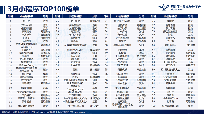 2018年4月18日,阿拉丁小程序核算途徑和阿拉丁指數(shù)一同發(fā)布了2018年3月TOP100小程序榜單。阿拉丁核算途徑和阿拉丁指數(shù)在榜單的實(shí)時性、算法、樣本數(shù)量、多職業(yè)維度(添加了小程序游戲、外交、轎車、圖片拍照等)四個方面進(jìn)行了全面晉級。