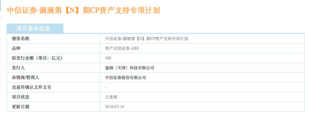 3月17日,上海證券交易所公司債券項(xiàng)目信息渠道顯現(xiàn),中信證券-滴滴第【N】期CP財(cái)物支撐專項(xiàng)方案于昨日受理。