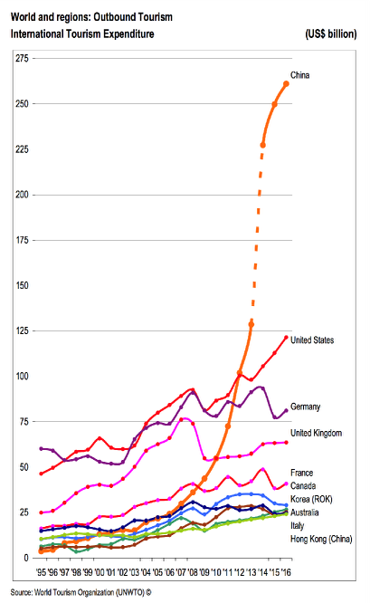 據(jù)統(tǒng)計,2016年我國出境花費到達2900億美元,居國際之首。我國以4%的護照持有率,變成全球出境花費額最高的國家。在將來五到十年內(nèi),跟
