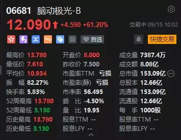 港股腦動極光-B在2025年9月15日的交易中表現(xiàn)非常驚人,一度拉升大漲超80%,報13.78港元,為接連第三日上漲,股價創(chuàng)上市新高,